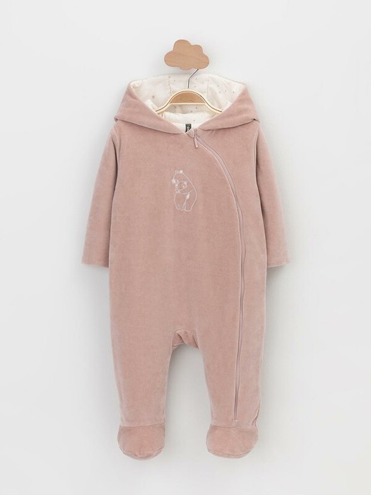 Тёплый комбинезон из велюра для новорождённых. Внутри синтепон и подклад из натурального хлопка. Изделие застёгивается на молнию и имеет капюшон. В размерах 80 и 86 на ножках манжеты. Все трикотажные полотна производятся в соответствии с нормами Швейцарского сертификата ЭкоТекс.