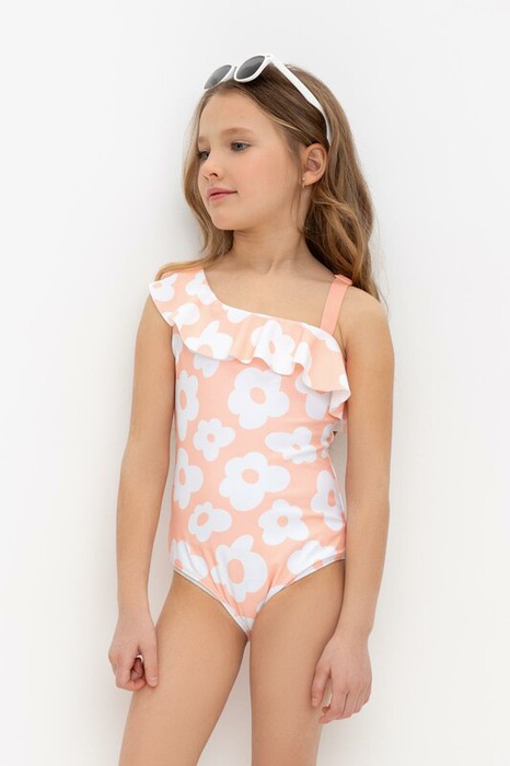 Слитный купальник на лямках для девочки. Украшен оборками. Оригинальная набивка выполнена из стойких гипоаллергенных красителей.
