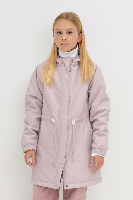 Демисезонное пальто для девочки с утеплителем SEE®: 120 г/м2. Выполнена из мембранной, фактурной ткани с дополнительной тефлоновой обработкой. Данный вид обработки предохраняет изделие от загрязнения и лучше отводит влагу. Подклад из 100% полиэстера. У изделия предусмотрена защита подбородка.  Несъемный  капюшон регулируется с помощью эластичного шнура со стопперами. Низ рукавов на эластичной резинке для лучшего прилегания. На талии утяжка при помощи шнура со стопперами. Боковые  карманы на молнии. Во всех изделиях верхнего ассортимента для безопасности ребенка предусмотрены светоотражающие элементы.