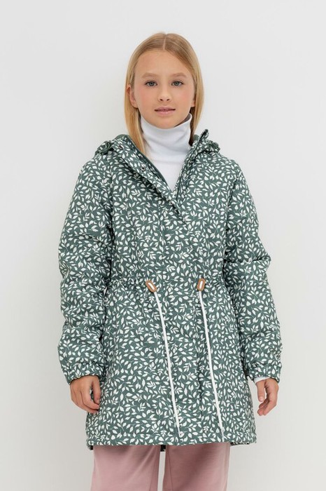 Демисезонное пальто для девочки с утеплителем SEE®: 120 г/м2. Выполнена из мембранной, фактурной ткани с дополнительной тефлоновой обработкой. Данный вид обработки предохраняет изделие от загрязнения и лучше отводит влагу. Подклад из 100% полиэстера. У изделия предусмотрена защита подбородка.  Несъемный  капюшон регулируется с помощью эластичного шнура со стопперами. Низ рукавов на эластичной резинке для лучшего прилегания. На талии утяжка при помощи шнура со стопперами. Боковые  карманы на молнии. Во всех изделиях верхнего ассортимента для безопасности ребенка предусмотрены светоотражающие элементы.