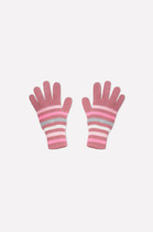 Вязаные перчатки из акриловой пряжи персикового цвета с мягкими полосатыми манжетами. Широкие манжеты крепко фиксируют перчатку на руке.