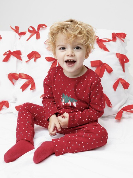 Трикотажная пижама из натурального хлопка.  Джемпер с длинными втачными рукавами и брюки с эластичной резинкой в поясе. Отлично подойдёт для создания праздничных образов или в качестве подарка малышу на Новый год и Рождество. Джемпер застёгивается на кнопки. По низу брюк мягкие манжеты. Оригинальная набивка и принт выполнены из стойких текстильных гипоаллергенных красителей. Изделие сохраняет цвет и форму после многократных стирок. Все трикотажные полотна производятся в соответствии с нормами швейцарского сертификата ЭкоТекс.
