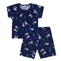 Трикотажная пижама из натурального хлопка. Футболка с короткими рукавами с принтом. У брюк эластичный пояс на резинке. Оригинальные принт и набивка выполнены из стойких, гипоаллергенных текстильных красителей. Пижама сохраняет цвет и форму после многократных стирок. Все трикотажные полотна производятся в соответсвии с нормами Швейцарского сертификата ЭкоТекс.