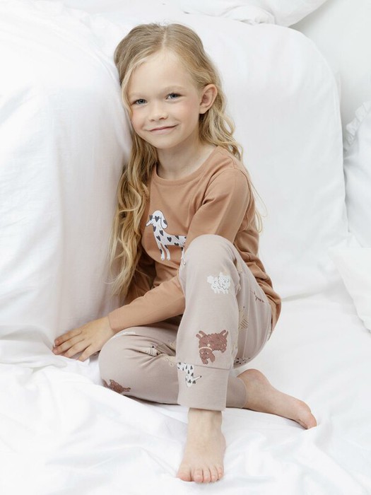Пижама для девочки из натурального хлопка. Джемпер с длинными втачными рукавами и брюки с эластичной резинкой в поясе. Мягкие манжеты по низу брюк сделаны из материала в рубчик. Оригинальная набивка и принт выполнены из стойких текстильных гипоаллергенных красителей. Изделие сохраняет цвет и форму после многократных стирок. Все трикотажные полотна производятся в соответствии с нормами швейцарского сертификата ЭкоТекс.