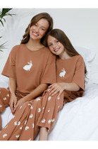 Комплект для комфортного сна и отдыха из гладкого трикотажного полотна. Футболка с короткими спущенными рукавами и прямые брюки с мягкой эластичной резинкой в поясе, которые удобно садятся по фигуре. Лёгкий материал приятен к телу, не теряет форму и позволяет коже дышать. Все трикотажные полотна производятся в соответствии с нормами швейцарского сертификата ЭкоТекс.
