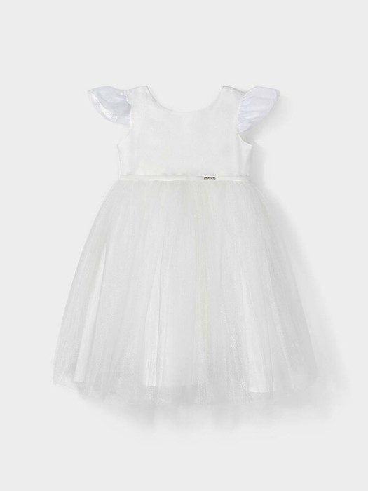 Нарядное белое платье с воздушными рукавами-крылышками для девочки. Изготовлено из атласа и сетки с блеском. Для удобства одевания платье застёгивается на пуговицы на спинке. С помощью бархатной ленты можно регулировать ширину изделия по талии. Платье сохраняет форму и стойкий цвет после многочисленных стирок и идеально подходит для праздников и фотосессий.