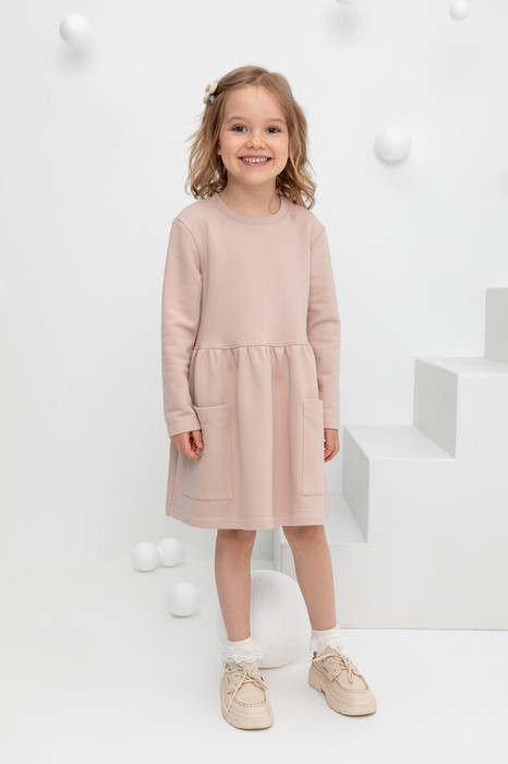 Трикотажное платье с длинными рукавами и накладными карманами из высококачественного петельчатого футера. В составе 80% натурального хлопка и 20% полиэстера, при этом полиэстер ввязан внутрь по особой технологии и не соприкасается с кожей. Изделие сохраняет цвет и форму после многократных стирок.