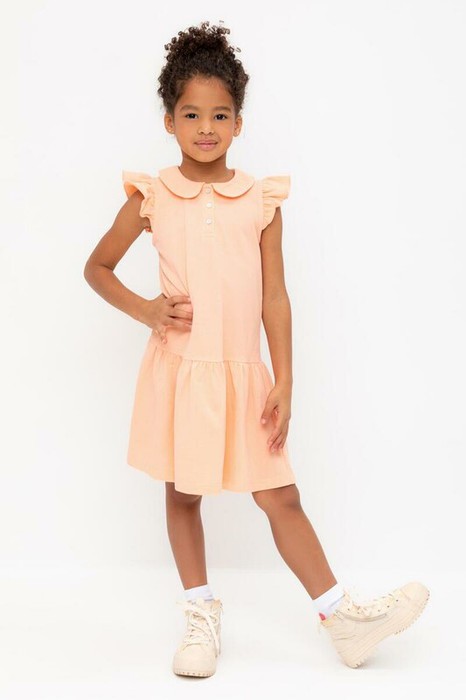 Платье для девочки из высококачественного трикотажа пике с воротничком и крылышками. Для удобства одевания платье застёгивается на кнопки спереди. Платье сохраняет форму и стойкий цвет после многочисленных стирок и идеально подходит на каждый день.