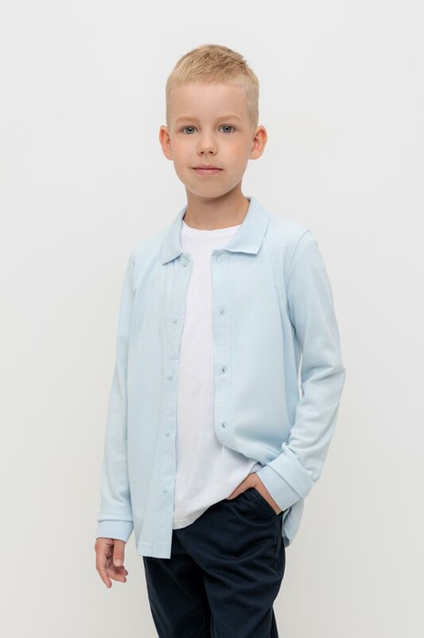 Рубашка школьная для мальчика из высококачественного трикотажного полотна пике. У изделия вязаный воротник, манжеты и застежка спереди на пуговицы.