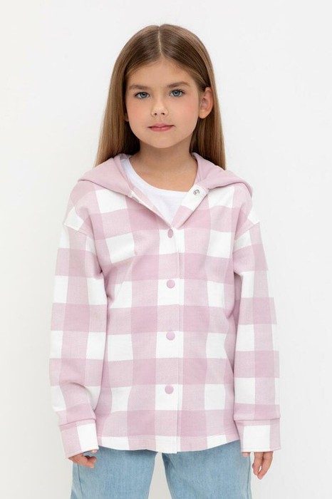 Свободная трикотажная рубашка для девочки с капюшоном. Выполнена из мягкого петельчатого футера. Застёгивается на кнопки. Модель с закругленным низом и спущенным плечом. По бокам разрезы.