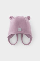 Двойная розовая шапка из полушерсти. Украшена нашивкой с изображением котика.