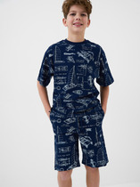 Трикотажный пижамный комплект из натурального хлопка. У футболки короткие рукава. Брюки с удобным поясом на резинке и утягивающим плетеным шнуром. Оригинальная набивка и принт выполнены из стойких, гипоаллергенных текстильных красителей. Все трикотажные полотна производятся в соответствии с нормами Швейцарского сертификата ЭкоТекс.
