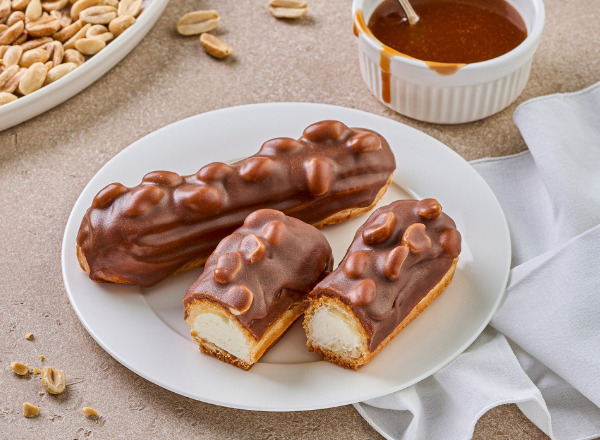 Заварное тесто со сливочным кремом, мягкой карамелью, декорированное жареным арахисом и молочным шоколадом.