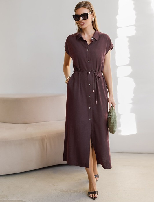 Состав: 70%Вис 30%Лен Плотность: 200 Г/м2Платье-рубашка коричневого цвета выполнено из натурального льна и вискозы, плотностью 200 Г/м2. Сочетание льна и вискозы обеспечивает комфорт и прохладу в жаркие дни. Это свободное платье на пуговицах по всей длине будет идеальным выбором для лета и весны. Благодаря качественному составу ткани, платье отлично держит форму, не сковывает движения и отличается износостойкостью. Отложной воротник добавляет классический акцент, удобный пояс подчеркивает талию, делая силуэт выразительным и женственным. Платье с коротким цельнокроеным рукавом смотрится современно, а высокие разрезы по бокам добавляют легкости и динамики образу. Подойдет на большие размеры, скроет возможные недостатки и подчеркнет достоинства фигуры. На высокий рост платье будет длины миди, а на низкий рост - длина макси. Такое красивое и легкое платье подойдет для работы, городской прогулки и повседневного стиля.