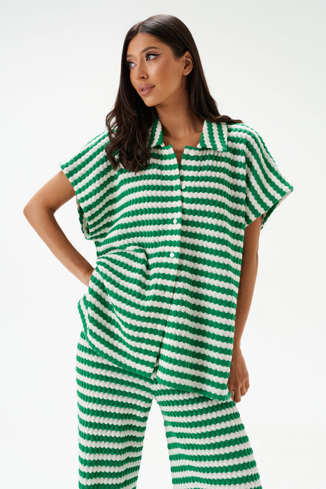 Джемпер свободного кроя. Выполнен из мягкого вязаного трикотажа. Воротник отложной. Вырез горловины круглый. Рукав цельнокроеный, спущенный. В боковых швах разрезы 21 см. Застёжка центральная; пуговицы. Длина рукава от горловины 29 см. Длина спинки 68 см