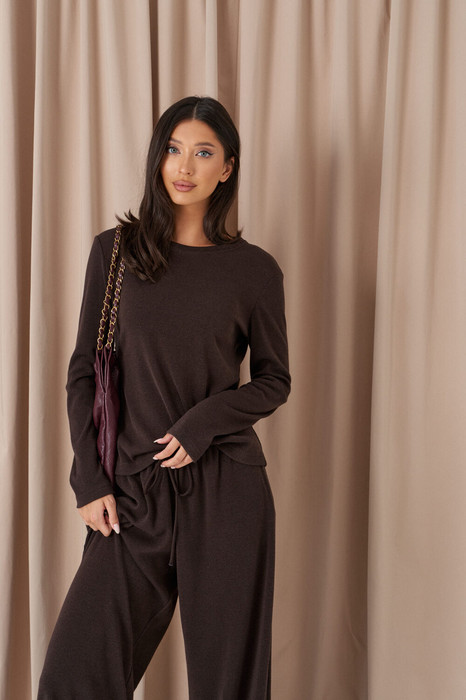 Джемпер выполнен из трикотажного полотна шоколадного цвета. Характеристики: полуприлегающий силуэт, овальная горловина. Рукав втачной, длина 63 см. Длина по спинке 58 см