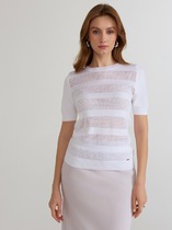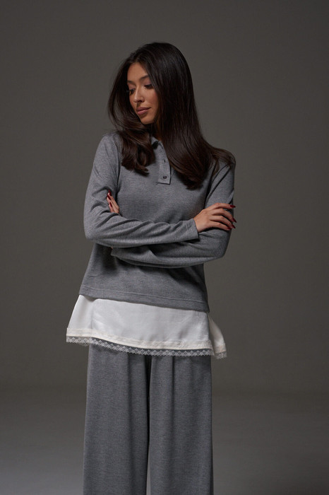 Джемпер прямого кроя. Выполнен из мягкого трикотажного полотна. Отложной воротник. В области горловины застежка на планке на петли пуговички. Рукав втачной. Длина рукава от края горловины 73 см. Длина спинки 56 см