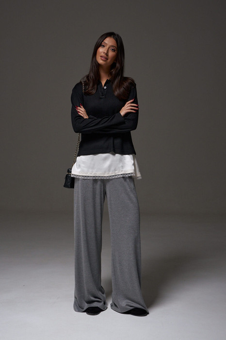 Джемпер прямого кроя. Выполнен из мягкого трикотажного полотна. Отложной воротник. В области горловины застежка на планке на петли пуговички. Рукав втачной. Длина рукава от края горловины 73 см. Длина спинки 56 см