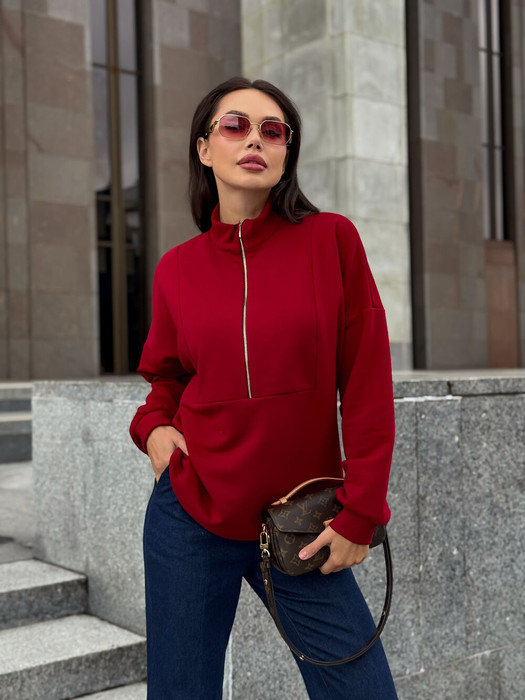 Джемпер трикотажный, свободного силуэта. Лиф обработан молнией, воротник притачной, свобдный, рукав втачной, свободный, по низу обработан манжетой, линия плеча спущена.