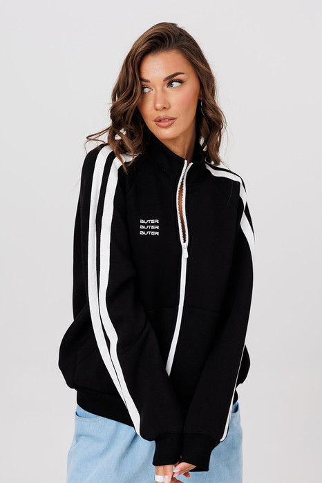 Джемпер трикотажный прямого силуэта с втачным длинным рукавом-реглан внизу на притачной манжете. Рукав с широкими настроченными лампасами. Полочка, с центральной застежкой на тесьму-молнию, карманом-кенгуру и печатью «BUTER». По низу джемпера притачная планка. Воротник-стойка. Джемпер без подкладки.