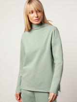 Джемпер женский свободного покроя из трикотажного полотна. Вырез горловины оформлен воротником - поло. Рукава - реглан. Низа изделия посажены на декоративные довязы.