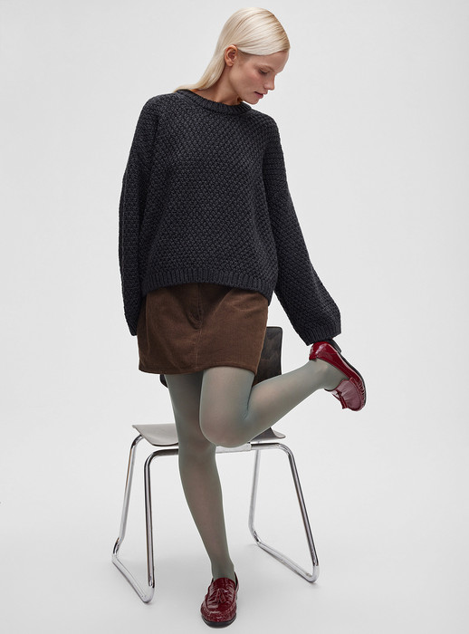 Джемпер из фактурного вязаного трикотажа, с цельным плечом и круглым горлом.