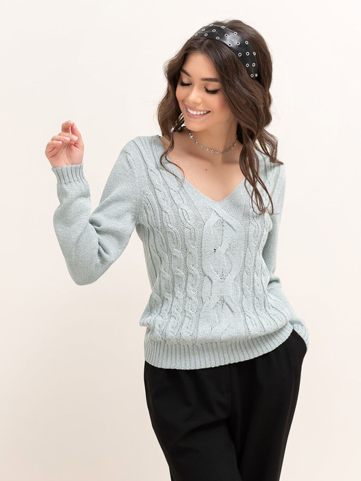 Джемпер женский выполнен из фасонной верёвочной пряжи с 75% содержанием струящейся вискозы. Силуэт изделия свободный, крой прямой. Рукав втачной прямого покроя. Вырез горловины V-образный. Пряжа имеет лёгкий благородный блеск с золотным отливом.