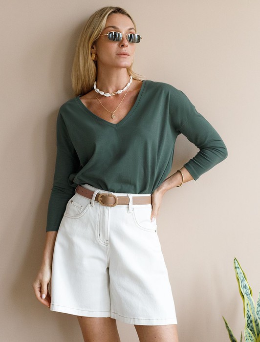 Состав: 92%Хлопок 8%ПУ Параметры модели на первом фото: Рост 170, бюст 83, талия 64, бедра 88Оливковый джемпер с длинными рукавами и глубоким V-образным вырезом сшит из премиального хлопка. Однотонная хлопковая модель свободного кроя хорошо поддерживает комфортный для тела микроклимат. Благодаря вплетению эластановых волокон вещь хорошо сохраняет форму.