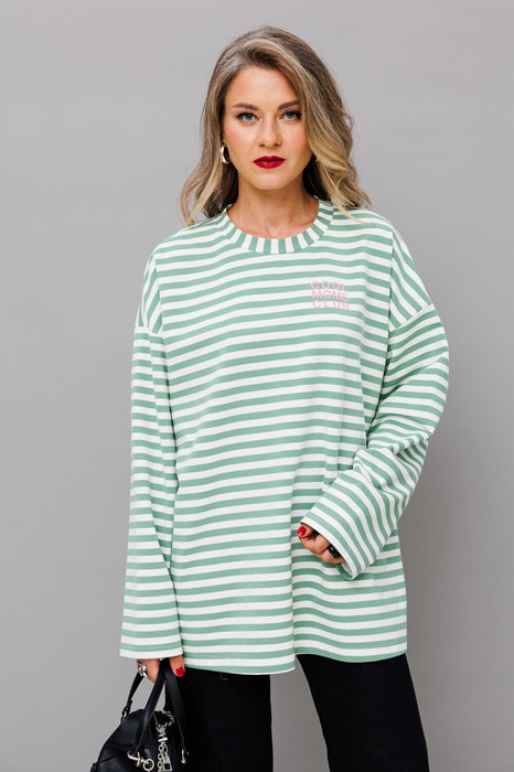 Лонг оверсайз прямого кроя. По переду и спинке выполнен дизайнерский принт "cool moms club". Ткань полосатая двухнитка. Длина - 70 см.