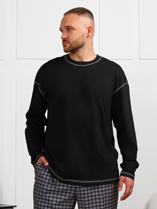 Джемпер мужской черный из трикотажного полотна кулирного переплетения. Модель со спущенной линией плеч, втачными рукавами, горловиной овальной формы, обработанной втачной планкой. В верхней части спинки - декоративная нашивка; по горловине, плечам, проймам, низу рукавов и низу джемпера - декоративные строчки контрастными нитками. Джемпер хорошо сочетается с брюками "Генри-1".