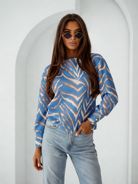 Женский джемпер Nika.pl. Мягкий трикотаж из акрила приятен к телу и дарит ощущение комфорта. Прямой  крой подойдет для фигуры любого типа. Модель дополнена  "вырезом-лодочкой" горловины и длинными рукавами. Рукава имеют длинную манжету с декоративными пуговицами. По низу джемпера манжета-резинка.