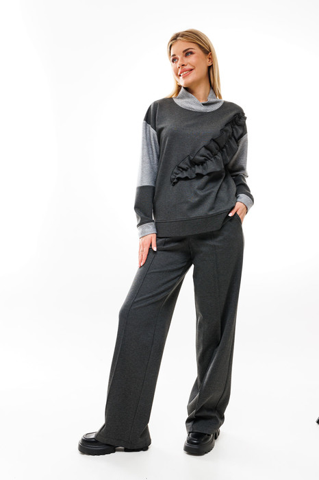 Джемпер комбинированный свободного кроя со спущенной линией плеча. Горловина обработана воротником-стойкой с запахом. Рукава со вставкой из текстурного трикотажа "косичка". По низу рукава и изделия есть манжета. По переду изделие декорировано фигурными фалдами из основной ткани. Длина изделия 71 см. Длина рукава 58 см.
