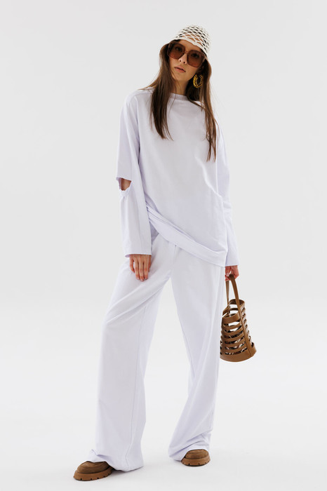Джемпер свободного силуэта с округлой горловиной. Рукав комбинированного кроя, с передними и задними швами. Верхняя и нижняя часть рукава образуют между собой разрез. По спинке изделие декорировано авторским вязаным элементом ручной работы.