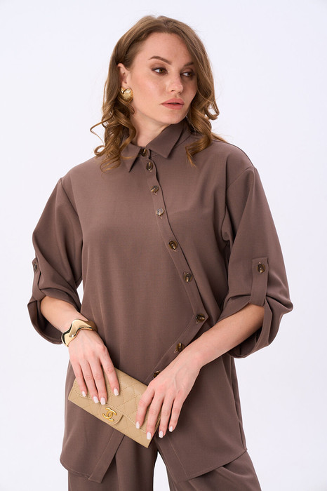 Жакет рубашечного типа прямого силуэта с асимметричным низом. Рукав втачной со спущенной линией плеча, фиксируется на пату. Застежка фигурная на петли и пуговицы, смещённая по косой. Воротник рубашечный.