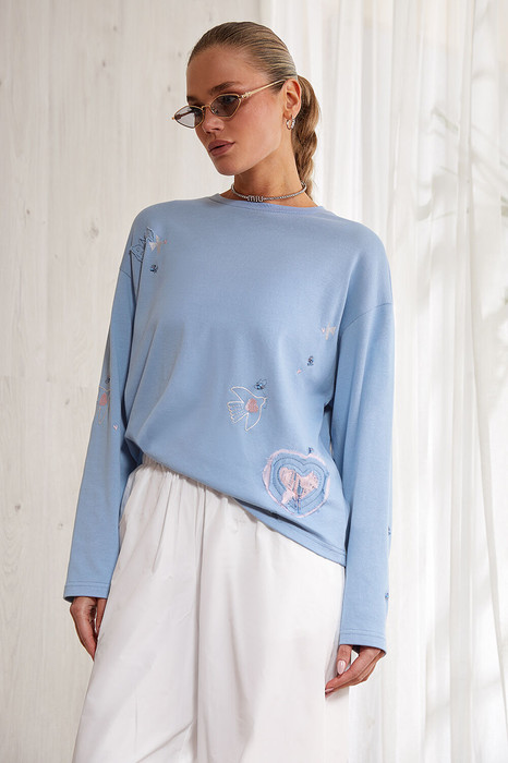 Джемпер свободного силуэта, выполнен из плотного премиального трикотажного полотна. Спущенная линия плеча. Рукав длинный. Спина прямая. Горловина круглая, с притачной планкой. Авторская вышивка на полочке ,спинке и рукавах изделия.