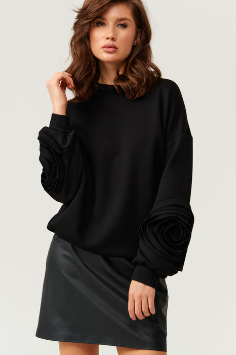 Джемпер женский из поливискозного трикотажного полотна для повседневной носки. Джемпер прямого силуэта. Низ изделия обработан притачным поясом. Горловина округлая. Линия плеча спущена. Рукава втачные, длинные, низ рукава обработан притачной манжетой, к низу рукава имеется дизайнерский декор в виде раскошных тканевых цветов . Очень стильный джемпер, который безусловно станет вашим фаворитом среди вашего гардероба. В нем вам безусловно будет комфортно, а главное вы будете выглядеть модно.