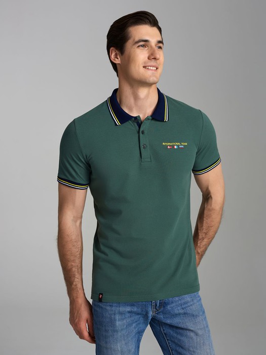 Футболка-поло из хлопкового полотна "пике". Классическая модель поло с короткими рукавами. Воротник и манжеты рукава выполнены из трикотажной рибаны темно-синего цвета с бело-желтой полосой. На полочке застежка-планка на пуговицах. На нижней планке и по горловине настрочена контрастная киперная тесьма. На полочке выполнена вышивка "INTERNATIONAL TEAM" и вышивка флагов. По низу футболки в боковых швах выполнены разрезы, обработанные тесьмой. С правой стороны полочки, по низу настрочен жаккардовый "флажок" с логотипом.
