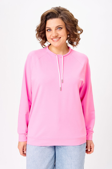 Джемпер женский из трикотажной хлопковой ткани (двунитка). Рукав реглан. Низ рукава обработан притачной манжетой. Низ изделия оформлен притачным поясом. На спинке настрочен декоративный элемент. Вырез горловины круглый, обработан бейкой со шнуром.