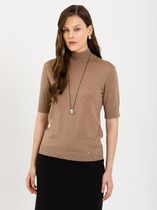 Джемпер из мягкого вискозного трикотажного полотна с люрексовой нитью, свободного силуэта со спущенной линией плеча. Горловина мягкой V-образной формы, рукав длинный, по низу присобран на манжеты из основной ткани, которые украшены тремя декоративными пуговицами. Низ джемпера оформлен притачной планкой из основной ткани.