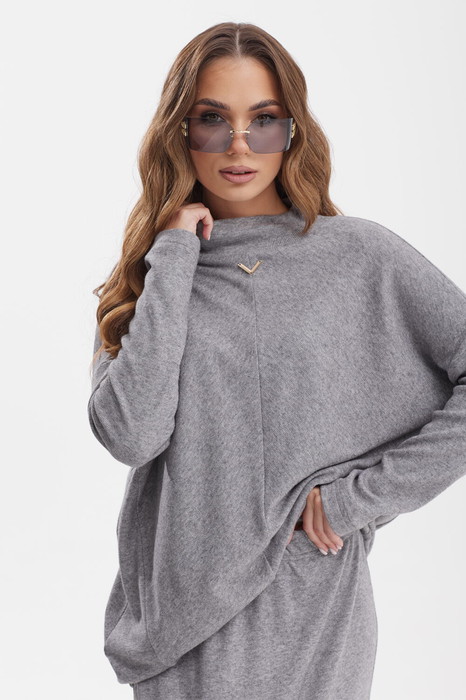 Джемпер удлиненный, свободной формы из трикотажного полотна. Воротник-стойка. Спущенная линия плеча. Рукав узкий.
