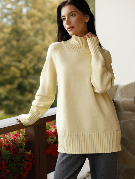 Джемпер с воротом стойка выполнен из мягкой пряжи с кашемиром. Модель свободного силуэта с рукавом реглан будет стильно сочетается с брюками и джинсами. Мягкая пряжа очень приятная к телу, поддержит комфорт на протяжении всего дня, при этом не перегревая. Сочетается в костюме с брюками D38.013, D38.012 и юбкой D36.016