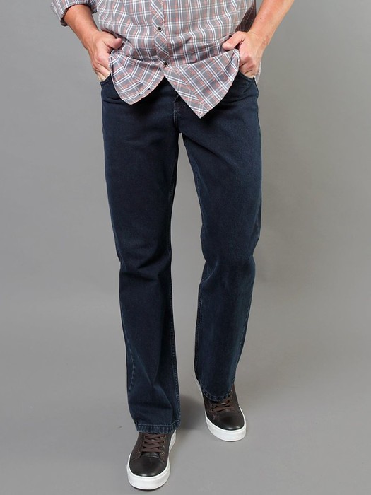 Мужские классические джинсы с пятью карманами. Посадка Comfort fit (свободные по бедру), высокая талия, широкие в колене и по низу. Застежка на молнии. Выполнены из традиционной хлопковой ткани denim, цвет ткани Blue/Black (лицевая сторона ткани темно-синяя, изнаночная сторона темно-серая). Классическая темная стирка с потёртостями только по швам. Параметры указаны для размера 32. Длина внутреннего шва 83,0 см.
