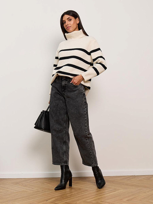 Джинсы Barrel (Бочка) - тренд сезона! Укороченные джинсы модного кроя Barrel с вытачками на коленях создают идеальный объемный силуэт "бочонка" - широкие в бедрах и плавно сужающиеся к низу. Это создает современный и очень стильный геометрический образ. Вытачки в области колена по внутреннему шву не просто являются дизайнерской изюминкой, но и дополнительно подчеркивают требуемый силуэт бочонка и обеспечивают идеальную посадку по ноге, сохраняя форму джинсов при движении. Укороченная длина "анкл" (ankle-length) визуально делает образ легче и современнее и идеально подходит для создания настроения легкой небрежности. Изготовлены из черного денима. Специальная стирка towel wash позволяет получить особый винтажный вид ткани с легким мраморным эффектом. Эта модель - идеальная пара для современных стильных и смелых образов.