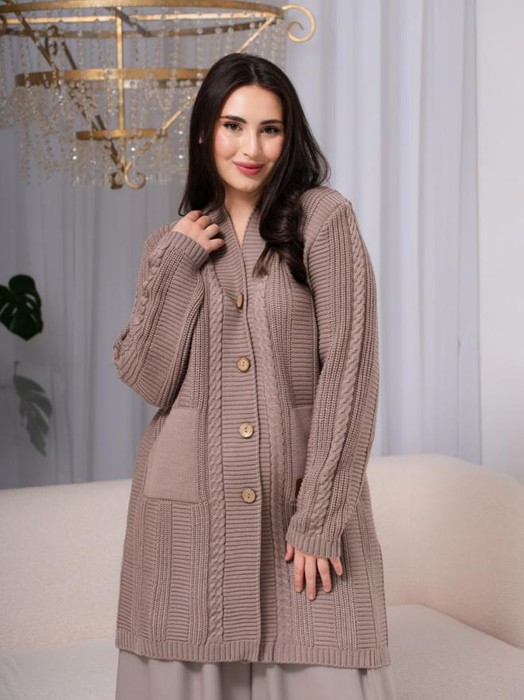ESENIA Кардиган женский полушерстяной удлиненный с косами - Кофе с молоком