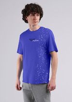 Фуфайка с коротким рукавом среднего объема, круглым вырезом горловины, которая оформлена обтачкой из рибаны.