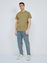 Фуфайка с коротким рукавом среднего объема, круглым вырезом горловины, которая оформлена обтачкой из рибаны.