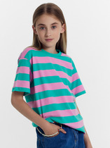 Футболка для девочки из трикотажного полотна "кармеланж" с приспущенным плечом, втачными короткими рукавами, горловиной овальной формы, обработанной втачной планкой и принтом на полочке, выполненным в технике шелкографии. По шву втачивания планки в горловину настрочена отделочная строчка.