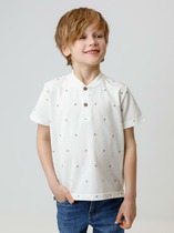 Футболка для мальчика классического покроя: с короткими втачными рукавами, горловиной овальной формы, обработанной втачной планкой, и принтом в центре переда, выполненным в технике шелкографии. По шву втачивания планки в горловину настрочена отделочная строчка на двухигольной машине. неижние срезы рукавов и изделия обработаны подгибкой.