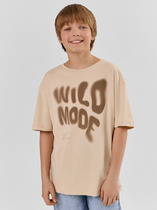 Футболка для мальчика из трикотажного полотна "кулирка" с приспущенным плечом, втачными короткими рукавами, горловиной овальной формы, обработанной втачной планкой и принтом на полочке, выполненным в технике шелкографии. По шву втачивания планки в горловину настрочена отделочная строчка.