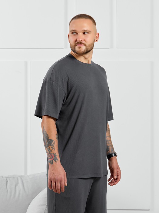 Футболка мужская из пластичного однотонного трикотажного полотна в рубчик, приятного к телу. Модель свободная, со спущенной линией плеч, рукавами длиной до локтя. Может подойти для отдыха, прогулок и занятий спортом.